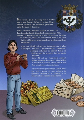 Née sur une plaine marécageuse et fondée par le duc Gérard d'Alsace en 1061, Nancy devient aussitôt une résidence princière... celle des ducs de Lorraine. Cette situation perdure jusqu'à la mort de l'ancien roi polonais Stanislas Leszczynski en 1768, date de l'intégration définitive a la France de ce duché et de cette ville, située au troisième millénaire au coeur du Grand Nancy, une métropole de plusieurs milliers d'habitants. Avec une histoire riche en évènements sur le plan artistique, culturel, gastronomique, industriel, politique, religieux ou sportif, Nancy se décline pour la première fois en bande bande dessinée. Cette BD est un formidable support pédagogique qui donne une vision inédite et fascinante de cette cité au destin à la fois tumultueux et prestigieux. Vous suivrez le personnage "Petit Jolo" qui vous guidera et vous mènera de manière instructive et ludique à la découverte de l'épopée nancéienne.