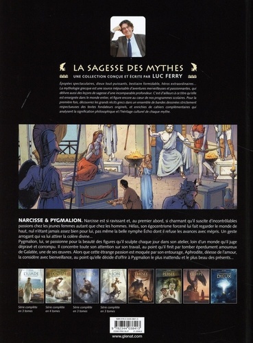 Deux figures captivantes de la mythologie. L'inconcevable beauté de Narcisse est un enchantement pour les yeux mais un poison pour l'âme. Ses prétendants sont nombreux, mais Narcisse est aussi beau qu'il est exécrable. Son égo surdimensionné lui fait regarder le monde de haut et considère que personne n'est assez bien pour lui... Pas même la nymphe Echo dont il refuse les avances avec mépris. Un geste insolent qui va attirer sur lui la colère divine... Pygmalion, lui, se passionne pour la beauté des figures qu'il sculpte chaque jour dans le bois et le marbre. Son attention se porte exclusivement sur son travail et, il finit par tomber éperdument amoureux de Galatée, une de ses oeuvres. Alors que cette étrange passion est moquée par son entourage, Aphrodite, déesse de l'Amour, la considère avec douceur. Grâce à elle, la singulière inclination de Pygmalion sera pleinement contentée, car Aphrodite offrira le plus beau des cadeaux à Galatée... Ce nouvel album de la collection "La Sagesse des Mythes" met en scène deux récits prenant l'amour et la beauté pour thématiques. Deux mythes passionnants aux angles distincts et aux multiples interprétations.