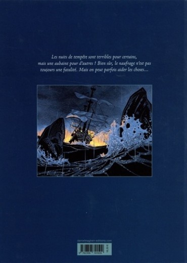 Une histoire de trésor maudit, de navires fracassés et de villageois pilleurs d'épaves. Jim, le plus jeune de ces villageois, deviendra-t-il à son tour un naufrageur ou gardera-t-il son innocence ? Résumé : Greenway, Angleterre, 14 octobre 1704. Les habitants scrutent la mer, un navire a été aperçu, luttant contre la tempête. Jim atteint l'âge d'être initié contre son gré aux activités nocturnes des adultes de son village : pour améliorer leur quotidien misérable, ils allument des feux qui amènent les navires à se fracasser sur la falaise accidentée. Le Mérédith les a vus, et il approche. Pour Greenway, c'est le navire de trop ! A son bord, un mystérieux passager, attendu par un Lord et porteur d'un fabuleux trésor. Le chevalier de St-Martin et son équipage sont portés disparus, des soldats partent à leur recherche, mais les villageois sont malins : ils ont tout caché, ou presque. Le pacte qui les lie les oblige à sacrifier l'un d'entre eux pour préserver leur secret. Des pirates de Weymouth, et leur chef " Le Capitaine ", découvrent leur secret et arrivent au village pour faire main basse sur le trésor. Tout aussi impitoyables, au prix de quelques meurtres, ils mettent la main sur la cachette du butin et sur l'épave du Mérédith au fond des eaux. Mais, à leur tour, ils sont victimes de la folie meurtrière du chef des naufrageurs... Jim assiste à tous ces meurtres en cascade, écoeuré. Il se réfugie dans les bois, avec pour compagnie son chien, le singe rescapé du naufrage et Jenny, la fille du chef du village, une jeune aveugle. Ni les pirates ni les naufrageurs ne mettront la main sur le trésor du chevalier. Il reviendra peut-être à celui qui ne le cherchait pas... Présentation : On entre dans cette terrible histoire de pirates par un biais inédit : celui de la côte, où les hommes se révèlent tout aussi mauvais que les pirates des mers. Le butin s'arrache par la ruse, la traîtrise, le sang, la violence. Face à leurs aînés, les tendres et innocents jeunes gens que sont Jim et Jenny ne peuvent que subir le mal ambiant et ce lourd fardeau qu'exercent les villageois. Ces naufrageurs ont réellement existé dans le royaume d'Angleterre du XVIIIe siècle. Des villages entiers, unis par le crime et le secret, assuraient leur survie en pillant les épaves des navires qu'ils attiraient sur les récifs. Le trait incisif, semi-réaliste de Gnoni rappelle celui des meilleurs illustrateurs de BD historique. Il porte admirablement les couleurs de cette belle histoire de pirates, servie par un scénario enlevé de Rodolphe, suintant le mal à souhait. Tous les ingrédients d'une bonne histoire de pirates sont là, et le pas de côté pour la rendre encore plus originale : les naufrageurs sont cette fois les - anti - héros de l'histoire.