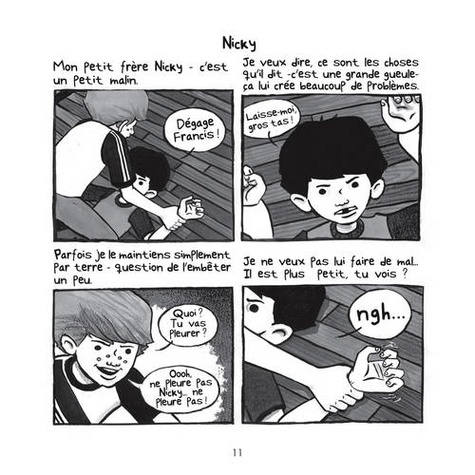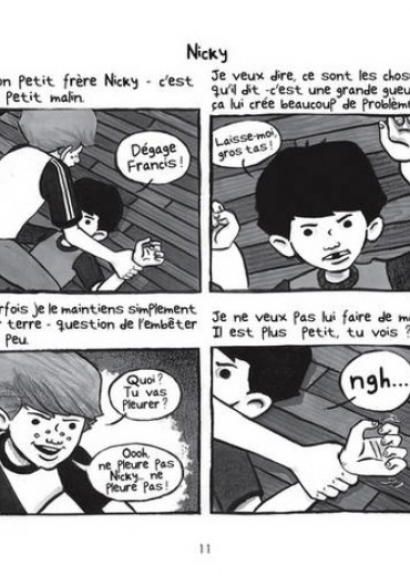 Ne pleure pas, est l’histoire de deux frères, Francis et Nicky. Francis, l’aîné, est le personnage principal et agit en tant que narrateur. L’histoire suit Francis pendant toute une année scolaire, quand il commence à éprouver ce que sont l’amour, la mort, la violence, le sexe. Sa relation avec Nicky est le véritable moteur de l’histoire. Ne pleure pas, c’est un conte de formation délicat et pénétrant. Un petit roman autobiographique qui joint à l’intimité du Blankets de Craig Thompson, la force douloureuse de L’Ascension du Haut Mal de David B. Le tracé naïf et la narration minimaliste relient directement cette oeuvre à la tradition de la BD underground aux Etats-Unis, dont s’est alimentée la propre enfance et adolescence de Lance Hansen, qui travaille actuellement comme professeur de dessin au primaire et au secondaire. Ne pleure pas a reçu beaucoup de louanges aux Etats-Unis pour le beau dessin de Hansen et ses histoires intimistes et mélancoliques.