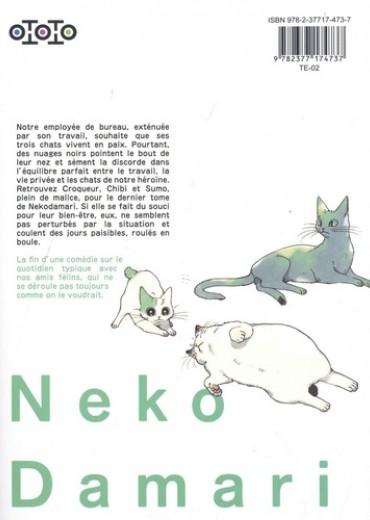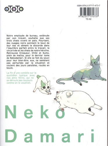 Notre employée de bureau, exténuée par son travail, souhaite que ses trois chats vivent en paix. Pourtant, des nuages noirs pointent le bout de leur nez et sèment la discorde dans l'équilibre parfait entre le travail, la vie privée et les chats de notre héroïne. Retrouvez Croqueur, Chibi et Sumo, plein de malice, pour le dernier tome de Nekodamari. Si elle se fait du souci pour leur bien-être, eux, ne semblent pas perturbés par la situation et coulent des jours paisibles, roulés en boule.