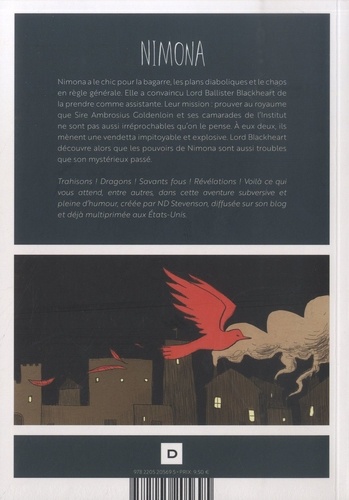 Nimona a le chic pour la bagarre, les plans diaboliques et le chaos en règle générale. Elle a convaincu Lord Balister Blackheart de la prendre comme assistante. Leur mission : prouver au royaume que Sire Ambrosius Goldenloin et ses camarades de l'Institut ne sont pas aussi irréprochables qu'on le pense. A eux deux, ils mènent une vendetta impitoyable et explosive. Lord Blackheart découvre alors que les pouvoirs de Nimona sont aussi troubles que son mystérieux passé.