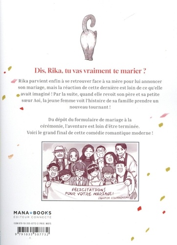 Dis, Rika, tu vas vraiment te marier ? Rika parvient enfin à se retrouver face à sa mère pour lui annoncer son mariage, mais la réaction de cette dernière est loin de ce qu'elle avait imaginé ! Par la suite, quand elle revoit son père et sa petite soeur Aoi, la jeune femme voit l'histoire de sa famille prendre un nouveau tournant ! Du dépôt du formulaire de mariage à la cérémonie, l'aventure est loin d'être terminée. Voici le grand final de cette comédie romantique moderne !