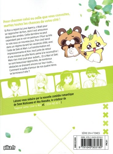 Si Pon a rejoint la Love Agency, c'était pour se rapprocher de Kon, dont il est amoureux depuis des années. Cette dernière ne peut cependant pas le voir en peinture ! Pour qu'elle le voie sous un nouveau jour, Pon s'est lancé dans un régime durant les vacances d'été, avec l'aide de Seki et Mari. La transformation est impressionnante et Kon, tout juste de retour d'une mission au pôle Nord, peine à le reconnaître ! Mais rien n'est joué pour autant... Et si Mari et Seki se sont beaucoup rapprochés, de nombreux obstacles se dressent encore sur leur route... Comment la quête d'amour de nos quatre héros se terminera-t-elle ? DERNIER TOME