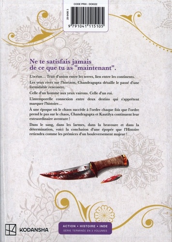 Ne te satisfais jamais de ce que tu as "maintenant". L'océan... Trait d'union entre les terres, lien entre les continents. Les yeux rivés sur l'horizon, Chandragupta détaille le passé d'une formidable rencontre. Celle d'un homme aux yeux vairons. Celle d'un roi. L'intemporelle connexion marquer l'histoire... A une époque où le chaos succède à l'ordre chaque fois que l'ordre prend le pas sur le chaos, Chandragupta et Kautilya continuent leur extraordinaire aventure ! Dans le sang, dans les larmes, dans la bravoure et dans la détermination, voici la conclusion d'une épopée que l'Histoire retiendra comme les prémices d'un bouleversement majeur !