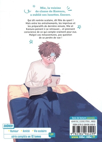 Mie, la voisine de classe de Komura, a oublié ses lunettes. Encore. Qui dit rentrée scolaire, dit fête du sport ! Mais entre les entraînements, les imprévus et les préparatifs de dernière minute, Mie et Komura peinent à se retrouver... et prennent conscience de ce qui compte vraiment pour eux. Malgré ces mésaventures, pas question de se perdre de vue !