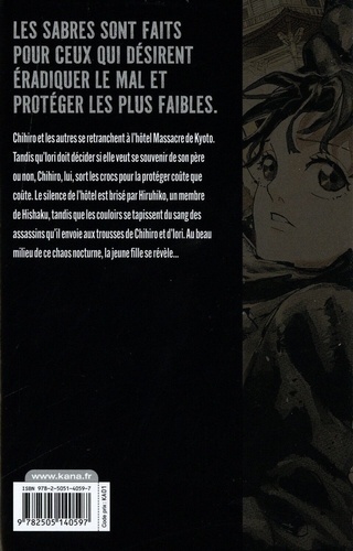 Les sabres sont faits pour ceux qui désirent éradiquer le mal et protéger les plus faibles. Chihiro et les autres se retranchent à l'hôtel Massacre de Kyoto. Tandis qu'Iori doit décider si elle veut se souvenir de son père ou non, Chihiro, lui, sort les crocs pour la protéger coûte que coûte. Le silence de l'hôtel est brisé par Hiruhiko, un membre de Hishaku, tandis que les couloirs se tapissent du sang des assassins qu'il envoie aux trousses de Chihiro et d'Iori. Au beau milieu de ce chaos nocturne, la jeune fille se révèle...
