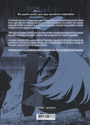 Un pacte scellé avec des sorcières redoutées ! Au royaume de Lowe, l'accord prévu avec Campusfellow est définitivement écarté. Omra Lowe, qui vient de s'emparer du pouvoir, refuse de remettre la sorcière des miroirs suspectée d'avoir assassinée le précédent monarque. Il accuse Campusfellow d'avoir trompé Lowe et engage les hostilités. Alors que les troupes de Bud Grace sont déjà acculées, de puissants magiciens du royaume d'Amelia s'ajoutent à la bataille, rendant toute perspective de victoire impossible. Au même moment, Rollo, envoyé libérer Teresalisa, apprend la vérité sur le meurtre du précédent roi des lions. La jeune femme, qui a révélé sa nature de sorcière, accepte de lui prêter main-forte pour se venger d'Omra. L'histoire trouve sa conclusion dans le dernier tome de ce manga de dark fantasy !