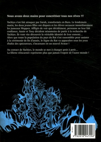 Nous avons deux mains pour concrétiser tous nos rêves ! ! ! Yachiyo s'est fait attaquer par Sarah, transformée en Bura. Le lendemain matin, les deux jeunes filles ont disparu et les élèves accusent immédiatement les jumeaux Wappen. Affligés de voir que décidément, personne ne leur fait confiance, Annie et Tony décident néanmoins de partir à la recherche de Yachiyo. Ils vont vite découvrir la véritable identité de leur ennemi... Alors que toute la population du pays du Rat s'est rassemblée pour assister à la cérémonie de fin d'année, le Signe du Rat va apparaître sous les yeux ébahis des spectateurs, s'incarnant en un nouvel Avatar ! Au contact de Yachiyo, le monde se met à changer petit à petit... La fillette réincarnée représente plus que jamais l'espoir de l'autre monde !