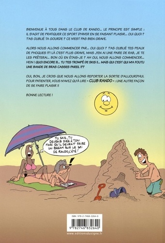 Bienvenue à tous dans le club de rando... Le principe est simple : il s'agit de pratiquer ce sport d'hiver en se faisant plaisir... Oui quoi ? Tas oublie ta gourde ? Ce n'est pas bien grave. Alors nous allons commencer par... Oui quoi ? Tas oublie tes peaux de phoques ! ? ! Là c'est plus grave, mais j'en ai une paire de rab, je te les prêterai... Bon ou en étais-je ? Ah oui, nous allons commencer... Hein ! Quoi encore ! ! !... Tu t'es trompé de skis ! !... Mais qui c'est qui m'a foutu une bande de bras cassés pareil ! ? ? Oui, bon, je crois que nous allons reporter la sortie d'aujourd'hui. Pour patienter, vous n'avez qu'à lire "club rando " : une autre façon de se faire plaisir ! ! Bonne lecture !