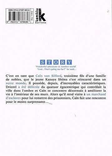 Embarquez pour une aventure fantasy drôle et surprenante qui s'amuse des codes du genre ! C'est en tant que Caïn von Silford, troisième fils d'une famille de nobles, que le jeune Kazuya Shiina s'est réincarné dans un autre monde. Il possède, depuis, d'incroyables caractéristiques. Drientl a été délivrée du quatuor égocentrique qui contrôlait la ville dans l'ombre et Caïn se concentre désormais à améliorer la vie à l'intérieur de ses murs. Alors qu'il rend visite à un marchand d'esclaves pour lui remettre des prisonniers, Caïn fait une rencontre pour le moins surprenante...