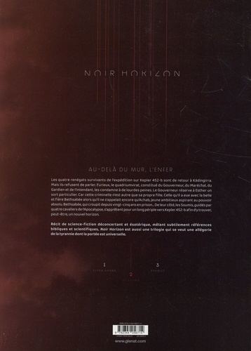 Les quatre renégats survivants de l'expédition sur Kepler 452-b sont de retour a Kadingirra. Mais ils refusent de parler. Furieux, le quadriumvirat, constitué du Gouverneur, du Maréchal, du Gardien et de l'Intendant. les condamné à de lourdes peines. Le Gouverneur réserve a Esther un sort particulier. Car cette criminelle n'est autre que sa propre Fille. Celle qu'il a eue avec la belle et fière Bethsabée alors qu'il ne s'appelait encore qu'Achab, jeune ambitieux aspirant au pouvoir absolu. Bethsabée, qui croupit depuis vingt-cinq ans en prison. De son côté, les Soumis, guidés par quatre cavaliers de l'apocalypse, s'apprêtent pour un long périple vers Kepler 452-b afin d'y trouver, peut-être, un nouvel horizon. Récit de science-fiction déconcertant et ésotérique, mêlant subtilement références bibliques et scientifiques, Noir Horizon est aussi une trilogie qui se veut une allégorie de la tyrannie dont la portée est universelle.
