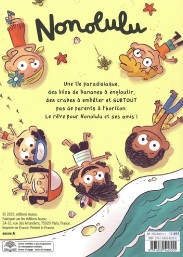 Une île paradisiaque, de bons fruits à déguster, des crabes à titiller et surtout pas de parents à l'horizon ? Le rêve pour Nonolulu ! Après le naufrage de leur bateau, Nonolulu et ses amis ont trouvé refuge sur une île paradisiaque et complètement déserte. Leurs parents leur envoient régulièrement des bouteilles avec des messages : ils arrivent les chercher, qu'ils ne fassent pas de bêtises en attendant ! C'est mal connaître Nonolulu qui, bien trop contente d'avoir une nouvelle vie sans parents, compte bien profiter des plaisirs de cette île fabuleuse, en entraînant ses copains dans toutes ses idées farfelues. Au programme : manger des kilos de bananes bien sucrées, faire une collection de coquillages bizarres et percer le mystère de la grotte qui parle.