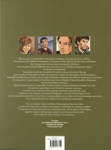 Blanche, la "Petite Licorne" qui marche sur les pas de son père alchimiste, entre en Champagne et découvre les attraits de la région. Alexandre l'alpiniste et son groupe atteignent Paris et Notre-Dame. Céline, future religieuse partie du Mont-Saint-Michel, quitte la Bretagne et la mystérieuse forêt de Brocéliande en compagnie d'"Angelo", ténébreux marcheur en cavale soupçonné d'être le récent meurtrier d'une jeune fille. Paul, de son vrai nom, est-il responsable de cet affreux crime, ou n'est-il qu'un petit bandit de grand chemin ? Céline en tombera-t-elle amoureuse, ou confirmera-t-elle sa décision d'entrer dans les ordres ? Alexandre grimpera-t-il tout en haut de la flèche de la cathédrale parisienne ? Autant d'interrogations que sème Jean-Claude Servais au gré des chemins de cette grande saga, qui continue à nous faire découvrir, d'un même mouvement, la beauté des régions de France.