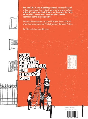 Fin août 2019, une militante propose sur les réseaux à des inconnues de se réunir pour un premier collage collectif contre les féminicides, sur les murs de Paris. En quelques semaines, le mouvement s'étend comme une traînée de poudre. Ce livre raconte l'histoire de ce collectif d'après l'enquête de Paola Guzzo et Romane Pellen Postface de Laurène Deycard