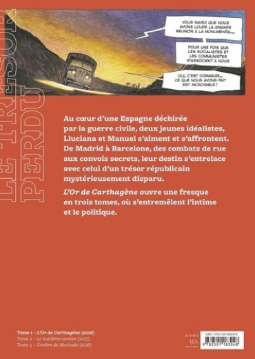Au coeur d'une Espagne déchirée par la guerre civile, deux jeunes idéalistes Lluciana et Manuel s'aiment et s'affrontent. De Madrid à Barcelone, des combats de rue aux convois secrets, leur destin s'entrelace avec celui d'un trésor républicain mystérieusement disparu. L'Or de Carthagène ouvre une fresque en trois tomes, où s'entremêlent l'intime et le politique.