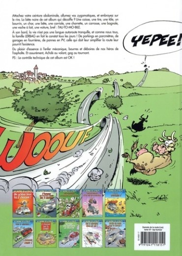 Attachez votre ceinture abdominale, allumez vas zygomatiques, et embrayez sur le rire. La bête noire de cet album qui décoiffe ? Une caisse, une tire, une tôle, un bourrin, un char, une bête, une carriole, une charrette, un carrosse, une bagnole, une vache à lait, une voiture, bref : l'AUTO-MO-BILE. A son bord, la vie n'est pas une longue autoroute tranquille, et comme nous tous, la famille LERBAG en fait le constat tous les l'ours ! De parkings en parcmètres, de garages en fourrières, de pannes en P,, celle qui doit leur simplifier la roule leur pourrit l'existence. Du plaisir d'essence à l'enfer mécanique, bourres et déboires de nos héros de l'asphalte. Et assurément, Achdé au valant, gag au tournant. PS : le contrôle technique de cet album est OK !