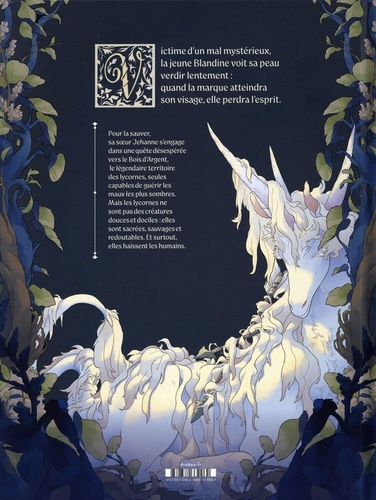 Victime d'un mal mystérieux, la jeune Blandine voit sa peau verdir lentement : quand la marque atteindra son visage, elle perdra l'esprit. Pour la sauver, sa soeur Jehanne s'engage dans une quête désespérée vers le Bois d'Argent, le légendaire territoire des lycornes, seules capables de guérir les maux les plus sombres. Mais les lycornes ne sont pas des créatures douces et dociles : elles sont sacrées, sauvages et redoutables. Et surtout, elles haïssent les humains.
