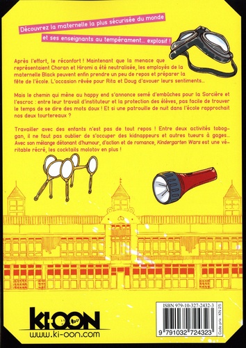 Découvrez la maternelle la plus sécurisée du monde et ses enseignants au tempérament... explosif ! Après l'effort, le réconfort ! Maintenant que la menace que représentaient Choran et Hiromi a été neutralisée, les employés de la maternelle Black peuvent enfin prendre un peu de repos et préparer la fête de l'école. L'occasion rêvée pour Rita et Doug d'avouer leurs sentiments... Mais le chemin qui mène au happy end s'annonce semé d'embûches pour la Sorcière et l'escroc : entre leur travail d'instituteur et la protection des élèves, pas facile de trouver le temps de se dire des mots doux ! Et si une enquête de nuit sur les phénomènes paranormaux qui ont lieu dans l'école rapprochait nos deux tourtereaux ? Travailler avec des enfants n'est pas de tout repos ! Entre deux activités toboggan, il ne faut pas oublier de s'occuper des kidnappeurs et autres tueurs à gages... Avec son mélange détonant d'humour, d'action et de romance, Kindergarten Wars est une véritable récré, les cocktails molotov en plus !