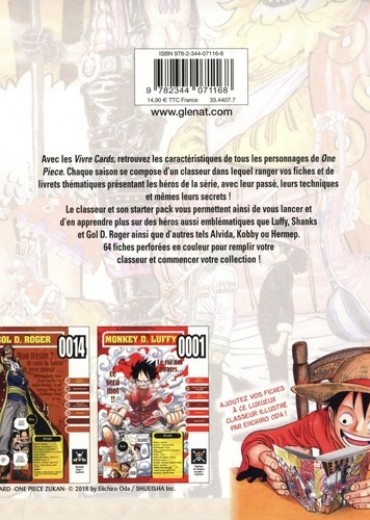 Avec les Vivre Cards, retrouvez les caractéristiques de tous les personnages de One Piece. Chaque saison se compose d'un classeur dans lequel ranger vos fiches et de livrets thématiques présentant les héros de la série, avec leur passé, leurs techniques et mèmes leurs secrets ! Le classeur et son starter pack vous permettent ainsi de vous lancer et d'en apprendre plus sur des héros aussi emblématiques que Luffy, Shanks et Gol D. Roger ainsi que d'autres tels Alvida, Kobby ou Hermep, 64 fiches perforées en couleur pour remplir votre classeur et commencer votre collection !