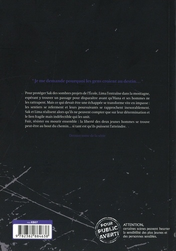 Pour protéger Sak des sombres projets de l'Ecole, Lima l'entraîne dans la montagne, espérant y trouver un passage pour disparaître avant qu'Hana et ses hommes ne les rattrapent. Mais ce qui devait être une échappée se transforme vite en impasse les sentiers se referment et leurs poursuivants se rapprochent inexorablement. Sak et Lima réalisent alors qu'ils ne peuvent compter que sur leur détermination et le lien fragile mais indéfectible qui les unit. Fuir, résister ou mourir ensemble : la liberté des deux jeunes hommes se trouve peut-être au bout du chemin... si tant est qu'ils puissent l'atteindre.
