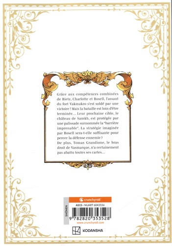 Grâce aux compétences combinées de Rietz, Charlotte et Rosell, l'assaut du fort Vakmakro s'est soldé par une victoire ! Mais la bataille est loin d'être terminée... Leur prochaine cible, le château de Samkh, est protégée par une palissade surnommée la "barrière imprenable". La stratégie imaginée par Rosell sera-t-elle suffisante pour percer la défense ennemie ? De plus, Tomas Grandione, le bras droit de Vasmarque, n'a certainement pas abattu toutes ses cartes...