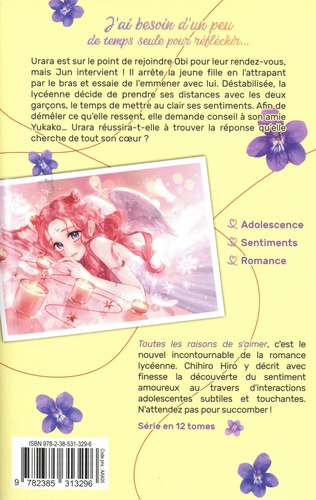 Urara est sur le point de rejoindre Obi pour leur rendez-vous, mais Jun intervient ! Il arrête la jeune fille en l'attrapant par le bras et essaie de l'emmener avec lui. Déstabilisée, la lycéenne décide de prendre ses distances avec les deux garçons, le temps de mettre au clair ses sentiments. Afin de démêler ce qu'elle ressent, elle demande conseil à son amie Yukako... Urara réussira-t-elle à trouver la réponse qu'elle cherche de tout son coeur ? J'ai besoin d'un peu de temps seule pour réfléchir... Toutes les raisons de s'aimer, c'est le nouvel incontournable de la romance lycéenne. Chihiro Hiro y décrit avec finesse la découverte du sentiment amoureux au travers d'interactions adolescentes subtiles et touchantes. N'attendez pas pour succomber !