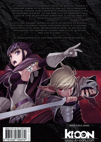 L'incroyable saga dark fantasy d'Etorouji Shiono est de retour ! Le chevalier Nazull, rapidement défait par Köinzell, parvient à prévenir l'Ordre de la présence du semi-elfe. Son compagnon Grishnan s'infiltre alors à Heleoh en espérant rapporter la tête du meurtrier de Glenn... Et son arme n'est pas ordinaire, car il s'agit de l'épée du roi défunt, forgée avec le fer des dieux et sertie d'elfes vivants ! Cette lame magique trouble les sens et les réflexes de Köinzell, en proie à d'étranges visions. Grièvement blessé, il est secouru par Aputo et ses alliés, qui découvrent alors un spectacle de dévastation : des traîtres se cachent dans la cité, qu'ils ont mise à feu et à sang !