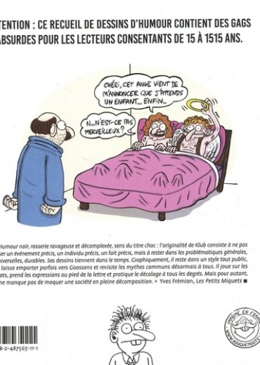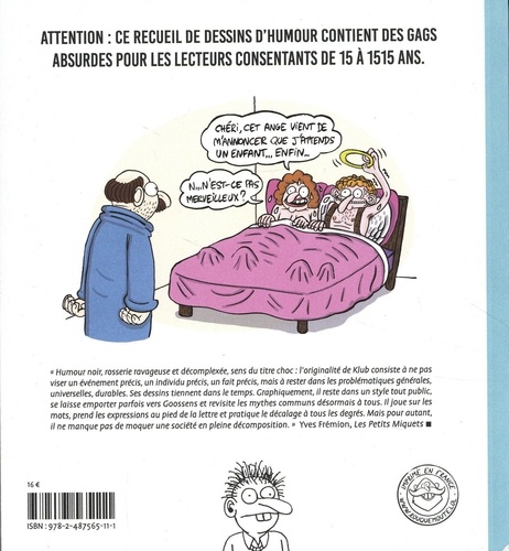 Objectif con : quand l'absurde dérape est un recueil de dessins d'humour qui contient des gags explosifs sur des sujets de société intemporels : la police, la guerre, la médecine, l'environnement, le travail, les religions ou encore la politique. Dans Les Petits Miquets (blog BD du Monde), Yves Frémion définit le travail de Klub ainsi : "Humour noir, rosserie ravageuse et décomplexée, sens du titre choc : l'originalité de Klub consiste à ne pas viser un événement précis, un individu précis, un fait précis, mais à rester dans les problématiques générales, universelles, durables. Ses dessins tiennent dans le temps. Graphiquement, il reste dans un style tout public, se laisse emporter parfois vers Goossens et revisite les mythes communs désormais à tous. Il joue sur les mots, prend les expressions au pied de la lettre et pratique le décalage à tous les degrés. Mais pour autant, il ne manque pas de moquer une société en pleine décomposition." Cet album compile des dessins publiés dans Psikopat.