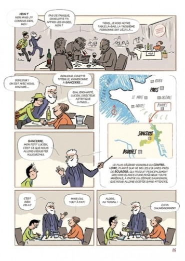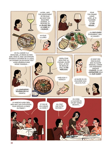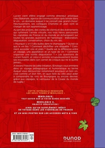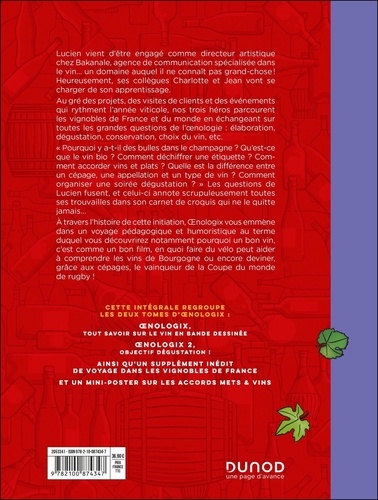 Lucien vient d'être engagé comme directeur artistique chez Bakanale, agence de communication spécialisée dans le vin... un domaine auquel il ne connaît pas grand-chose ! Heureusement, ses collègues Charlotte et Jean vont se charger de son apprentissage. Au gré des projets, des visites de clients et des événements qui rythment l'année viticole, nos trois héros parcourent les vignobles de France et du monde en échangeant sur toutes les grandes questions de l'oenologie : élaboration, dégustation, conservation, choix du vin, etc. "Pourquoi y a-t-il des bulles dans le champagne ? Qu'est-ce que le vin bio ? Comment déchiffrer une étiquette ? Comment accorder vins et plats ? Quelle est la différence entre un cépage, une appellation et un type de vin ? Comment organiser une soirée dégustation ? " Les questions de Lucien fusent, et celui-ci annote scrupuleusement toutes ses trouvailles dans son carnet de croquis qui ne le quitte jamais... A travers l'histoire de cette initiation, Onologix vous emmène dans un voyage pédagogique et humoristique au terme duquel vous découvrirez notamment pourquoi un bon vin, c'est comme un bon film, en quoi faire du vélo peut aider à comprendre les vins de Bourgogne ou encore deviner, grâce aux cépages, le vainqueur de la Coupe du monde de rugby ! Cette intégrale regroupe les deux tomes d'Onologix (Onologix, Tout savoir sur le vin en bande dessinée, et Onologix 2, Objectif dégustation ! ) ainsi qu'un supplément inédit de voyage dans les vignobles de France et un mini-poster sur les accords mets & vins.