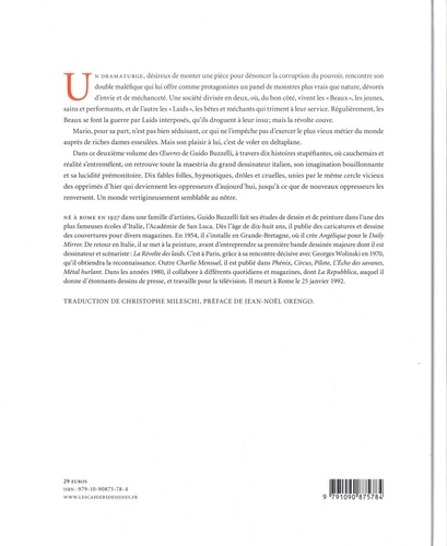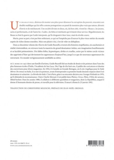 Un dramaturge, désireux de monter une pièce pour dénoncer la corruption du pouvoir, rencontre son double maléfique qui lui offre comme protagonistes un panel de monstres plus vrais que nature, dévorés d'envie et de méchanceté. Une société divisée en deux, où, du bon coté, vivent les "Beaux", les jeunes, sains et performants, et de l'autre les "Laids", les bêtes et méchants qui triment à leur service. Régulièrement, les Beaux se font la guerre par Laids interposés, qu'ils droguent à leur insu ; mais la révolte couve. Mario, pour sa part, n'est pas bien séduisant, ce qui ne l'empêche pas d'exercer le plus vieux métier du monde auprès de riches dames esseulées. Mais son plaisir à lui, c'est de voler en deltaplane. Dans ce deuxième volume des Oeuvresde Guido Bozzelli, à travers dix histoires stupéfiantes, où cauchemars et réalité s'entremêlent, on retrouve toute la maestria du grand dessinateur italien, son imagination bouillonnante et sa lucidité prémonitoire. Dix fables folles, hypnotiques, drôles et cruelles, unies par le même cercle vicieux des opprimés d'hier qui deviennent les oppresseurs d'aujourd'hui, jusqu'à ce que de nouveaux oppresseurs les renversent. Un monde vertigineusement semblable au nôtre.