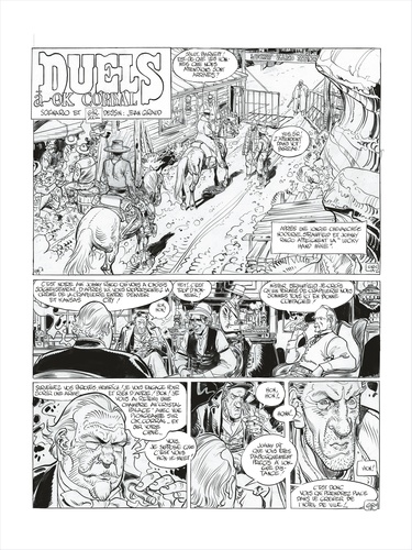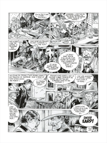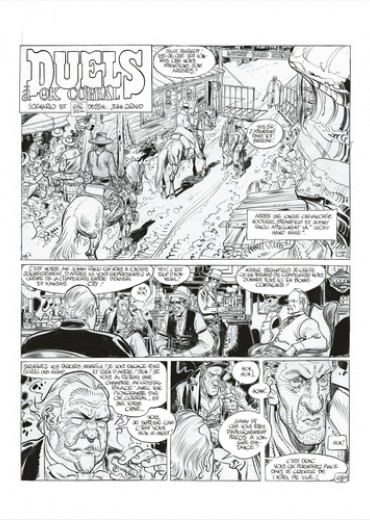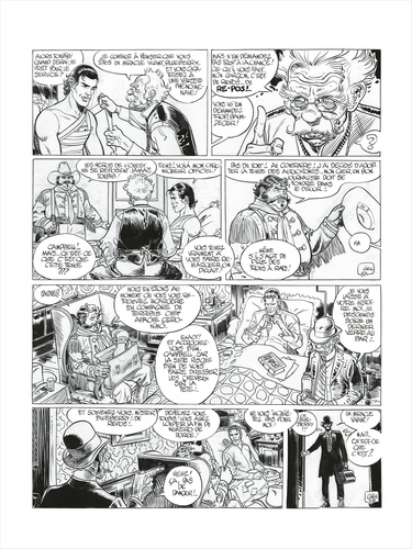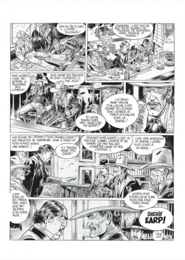 De Tombstone, d'OK Corral, la légende n'a retenu qu'un fameux duel collectif qui a vu, un matin de 1881, quatre célèbres malfrats, le clan Clanton et McLaury, tomber sous les balles des non moins illustres frères Earp épaulés par Doc Holliday. Mais ce fut loin d'être le seul règlement de compte qui eut pour cadre, ce jour-là, le mythique bled perdu de l'Arizona, situé à quelques miles de la frontière mexicaine. Du moins à en croire les dernières aventures de Blueberry, décidément toujours dans les parages lorsque l'Histoire s'écrit. Non pas qu'on puisse reprocher à cette éternelle tête de lard d'être allé au-devant du danger et des ennuis. Une fois n'est pas coutume, ce sont plutôt les pépins et les embrouilles qui sont venus à lui. Depuis que celui qui se fait désormais appeler Mister Blueberry semble définitivement avoir tourné le dos à l'armée et s'être résigné à l'idée que Chihuahua Pearl ne sera jamais la femme de sa vie, il s'est installé, désabusé mais plus intransigeant que jamais, à Tombstone. Plus précisément au Bird Cage, lieu mal famé faisant un peu office d'hôtel, pas mal de saloon et beaucoup de tripot, dont il ne quitte plus les tables de jeux. Il faut dire que Mike Blueberry, démobilisé au propre comme au figuré, peut s'offrir un plaisir inédit : vérifier jour après jour que sa chance insolente ne l'a pas quitté bien qu'il soit repassé, pour la première fois depuis sa jeunesse brisée, dans le camps des nantis. Car Mister Blueberry dispose à présent d'une petite fortune, ce trésor des Confédérés que lui a laissé le président Grant en dédommagement de ses nombreuses années gâchées, de son honneur trop longtemps entâché. C'est donc pour tirer un trait, oublier et se faire oublier que notre anti-héros miraculé est venu se poser à Tombstone. Un élégant préretraité porté sur la bouteille et le cigare, taciturne flambeur goûtant aux joies d'un relatif anonymat dans une ville minière qui compte déjà son petit lot de célébrités : les frères Earp, Wyatt, Virgil et Morgan, qui tentent d'y faire régner la loi, leur copain Doc Holliday ainsi que les notoires hors-la-loi du clan Clanton-McLaury. Et, bien sûr, la vedette du Bird Cage, la brune brûlante Doree Malone, chanteuse-danseuse-entraîneuse au charme et au talent certains. Evidemment, on se dit que dans un tel environnement, notre ex-lieutenant tête brûlée, rétif à toute figure d'autorité, allergique à toute violence gratuite ou intéressée et séducteur malgré lui, ne pouvait pas rester tranquille longtemps. Et pourtant, ce n'est pas son naturel mais son passé qui va le rattrapper. Sous les traits d'un père désireux de venger la mort de son fils suicidé, malheureux perdant d'une partie de poker contre Mike, d'un écrivain débarqué de Boston venu recueillir les mémoires de l'homme qui sauva la vie du Président et d'un valeureux chef indien aux abois qu'il croisa autrefois, Géronimo. De la plus étrange et inattendue des façons, Blueberry est condamné à rebasculer dans l'action. A la fin du premier album de ce cycle entamé en 1995 dont Duels à OK Corral est le quatrième volume, il s'effondre, le corps truffé de plombs. Mort. Ou presque. Au début de l'épisode suivant (Ombres Sur Tombstone), il revient péniblement à la vie. Une divine renaissance qui le verra, pour un bon moment, cloué au lit, materné par la délicieuse Doree. L'occasion rêvée pour enfin se retourner, tirer l'enseignement de son tumultueux passé. Pour que, rétabli, il puisse à nouveau avancer et, surtout, faire éclater la vérité, tenter de sauver la tête d'un brave guerrier injustement abusé et accusé. Ce récit (Géronimo, l'Apache), haletant, haché, sans cesse interrompu par son fragile état de santé, il le confie au biographe bostonien, comblé, terrifié. Tandis que Blueberry revit dans sa tête ses exploits et erreurs passés, autour de Tombstone, les meurtres, les complots et les coups fourrés se multiplient. Gamin ivre de vengeance, tueur à gage aux moeurs de serial killer sérieusement détraqué, puissant homme d'affaires sans pitié, jeune amoureux révolté par l'assassinat de sa fiancée, une troupe de sanguinaires et cupides fanfarons, de fiers et arrogants justiciers et une poignée d'Apaches manipulés : lentement, tous ces individus violents - par nature ou par nécessité - aux intérêts divergents progressent vers une inévitable tragédie. Telle est la trame qui ne cesse de monter en intensité tout au long du terrifant et palpitant Duels à OK Corral. Un étourdissant et sombre western d'action doublé du plus passionnant des parcours initiatiques, une vertigineuse mise en abîme totalement maîtrisée, l'aboutissement d'un des plus longs mais inspirés passages de témoin de l'histoire de la BD. Car comment ne pas voir dans cette mort si symbolique de Blueberry, ce va-et-vient incessant entre le passé et le présent, un monumental hommage à Jean-Michel Charlier, créateur et scénariste de la série jusqu'à sa disparition en 1989 ? En immobilisant temporairement son personnage principal, Jean Giraud lui fait porter le deuil de son co-géniteur de génie, l'oblige à considérer l'existence exceptionnelle et insensée qu'il lui a fait mener, les colossaux vécu et bagage psychique qu'il lui a légués. Et le dessinateur de relever le défi avec brio de s'affirmer plus que digne de poursuivre l'aventure seul, imaginant une intrigue riche, foisonnante et sophistiquée, à l'image de son trait unique, mainte fois imité, et toujours, quarante ans après, en progrès. Le cycle Mister Blueberry, inscrit, dès son titre à double sens (Mister/mystère) et au détour de chaque planche, sous le signe de la dualité (pouvait-il en être autrement de la part d'un homme qui abrite en lui deux dessinateurs accomplis, Giraud et Moebius, aux styles radicalement opposés ? ) est une époustouflante succession d'audaces, tant s