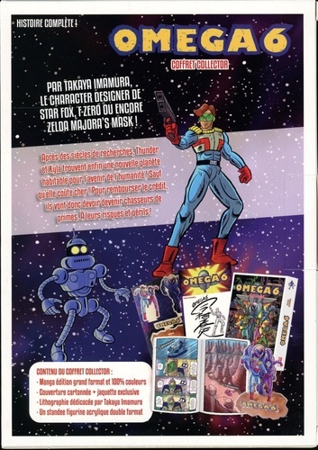 La version collector ultime du tout premier manga d'une super star de Nintendo, en exclusivité mondiale chez Omaké Manga ! Coffret collector cartonné comprenant : - Le manga version Deluxe (grand format - 100 % en couleurs) - Une jaquette exclusive - Un standee figurine acrylique double format (3 personnages en action) - Une lithographie dédicacée par l'auteur POINTS FORTS - Une histoire complète en 1 tome. - L'auteur est une super star de Nintendo, reconverti en mangaka depuis cette année ! - Omega 6 est son premier manga original et il a choisi Omaké Manga pour le publier en exclusivité mondiale ! - Un style rétro/futuriste particulièrement insolite et qui mélange aussi les spécificités du manga et des comics. - D'innombrables clins d'oeil (visuels, etc.) aux mega hits qu'il a créé chez Nintendo : Star Fox, F-Zero, etc. - Un humour omniprésent et un character design déliberrement kitsch. RESUME DE L'OEUVRE Après des mois de cryogénisation dans leur vaisseau spatial, Thunder et Kyla sont enfin réveillés. Ils sont chasseurs de primes et la cible après laquelle ils couraient vient enfin d'être localisée sur une planète lambda. Mais alors qu'ils pensaient ne faire qu'une bouchée de lui, leur adversaire Petrogaze s'avère bien plus coriace que prévu...