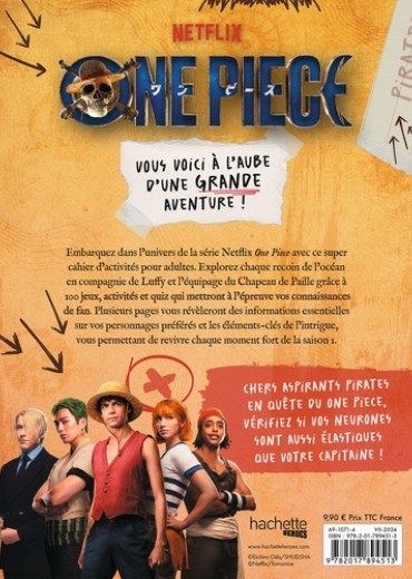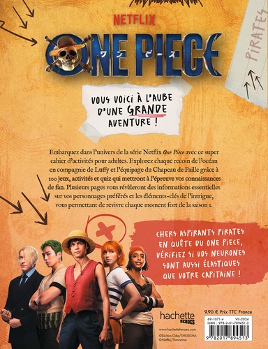 Vous voici à l'aube d'une grande aventure ! Embarquez dans l'univers renversant de la série Netflix One Piece avec notre super cahier d'activités pour adultes. Parcourez 64 pages de challenges captivants en compagnie de Luffy, Nami, Zoro et l'équipage du Chapeau de Paille : explorez chaque recoin de l'océan grâce à des jeux périlleux, des activités palpitantes et des quiz qui mettront à l'épreuve vos connaissances de fan. Plusieurs pages vous révèleront des informations essentielles sur vos personnages préférés et les éléments-clés de l'intrigue, vous permettant de revivre chaque moment fort de la saison 1. Ce livre d'activités est parfait pour tous les aspirants pirates en quête du One Piece, souhaitant vérifier si leurs neurones sont aussi élastiques que leur capitaine !