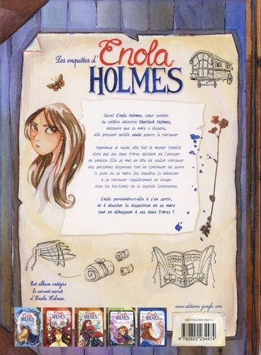 Les albums Jungle à petits prix ! Quand Enola Holmes, soeur cadette du célèbre détective Sherlock Holmes, découvre que sa mère a disparu le jour de son anniversaire, en ne lui laissant pour mot qu'un recueil sur les fleurs, et un carnet de messages codés, elle se met rapidement à sa recherche. Elle va devoir recourir à son sens de la débrouille, ainsi qu'à d'ingénieuses techniques de déguisement afin de fuir le manoir familial alors que ses deux frères se sont mis en tête de l'envoyer en pension afin de faire d'elle une vraie "Lady". Mais rien ne la prépare à ce qui l'attend. Son chemin la conduit rapidement dans les quartiers sombres et malfamés de Londres, et elle se retrouve impliquée dans le kidnapping d'un jeune marquis. Enola arrivera-t-elle à s'en sortir seule, et continuer de suivre la piste de sa mère tout en échappant à ses deux frères ?