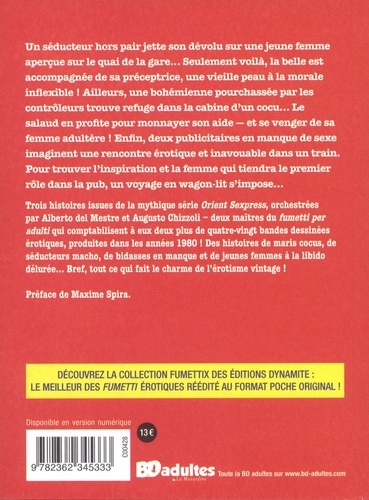 Un séducteur hors pair jette son dévolu sur une jeune femme aperçue sur le quai de la gare... Seulement voilà, la belle est accompagnée de sa préceptrice, une vieille peau à la morale inflexible ! Ailleurs, une bohémienne pourchassée par les contrôleurs trouve refuge dans la cabine d'un cocu... Le salaud en profite pour monnayer son aide - et se venger de sa femme adultère ! Enfin, deux publicitaires en manque de sexe imaginent une rencontre érotique et inavouable dans un train. Pour trouver l'inspiration et la femme qui tiendra le premier rôle dans la pub, un voyage en wagon-lit s'impose... Trois histoires issues de la mythique série Orient Sexpress, orchestrées par Alberto del Mestre et Augusto Chizzoli - deux maîtres du fumetti per adulti qui comptabilisent à eux deux plus de quatre-vingt bandes dessinées érotiques, produites dans les années 1980 ! Des histoires de maris cocus, de séducteurs macho, de bidasses en manque et de jeunes femmes à la libido délurée... Bref, tout ce qui fait le charme de l'érotisme vintage ! Préface de Maxime Spira. DECOUVREZ LA COLLECTION FUMETTIX DES EDITIONS DYNAMITE : LE MEILLEUR DES FUMETTI EROTIQUES REEDITE AU FORMAT POCHE ORIGINAL !