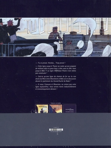 "- Tu es pressé. Nicolas... Trop pressé ! - Cette ligne jusqu'à Thann ne coûte qu'une poignée de millions alors tu peux bien y aller sans la SIM. mais jusqu'à Bâle ? ! La ligne Mulhouse-Thann n'est même pas construite ! - Sais-tu qu'une ligne de chemin de fer sur la rive droite du Rhin entre Mannheim et Bâle est en discussion devant le parlement du Grand-Duché de Bade ? - Si nous, Français et Alsaciens, ne créons pas cette ligne aujourd'hui, nous serons morts industriellement et économiquement demain ! "