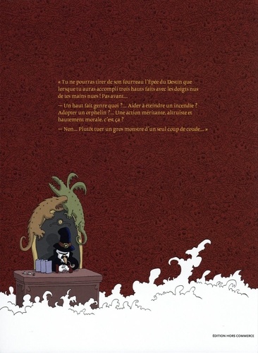 "Tu ne pourras tirer de son fourreau l'Epée du Destin que lorsque tu auras accompli trois hauts faits avec les doigts nus de tes mains nues ! Pas avant... - Un haut fait genre quoi ? ... Aider à éteindre un incendie ? Adopter un orphelin ? ... Une action méritante, altruiste et hautement morale, c'est ça ? - Non... Plutôt tuer un gros monstre d'un seul coup de coude..."