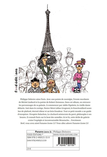 Philippe Delestre aime Paris. Avec une pointe de nostalgie, l'ironie mordante de Michel Audiard et la poésie de Robert Doisneau. Dans cet album, on retrouve les personnages de sa galaxie. A commencer par Adèle Pipelette, la vieille dame délurée. Suit dans le cortège, Nestor Béret (allias Grognon), le franchouillard assez bas de plafond, éternel râleur et un brin fraudeur. Tout ce petit monde a un guide d'exception : Prosper Baluchon, le clochard aristocrate du pavé, philosophe à ses heures. Il connaît Paris sur le bout des semelles. Ici et là, cette drôle de galerie croise l'espiègle et incontournable Moustache... Forcément. Bref, vous avez aimé Paname (tome 1) ? Vous allez adorer Paname (tome 2) !