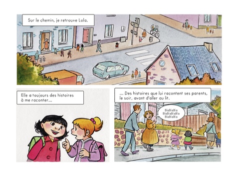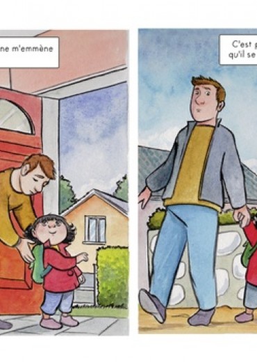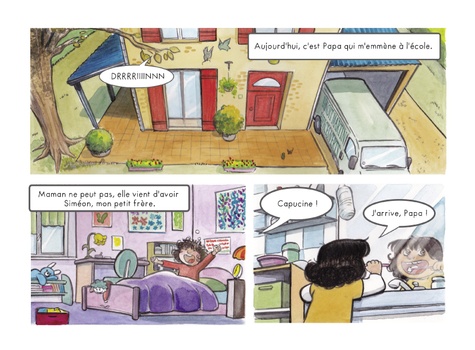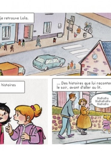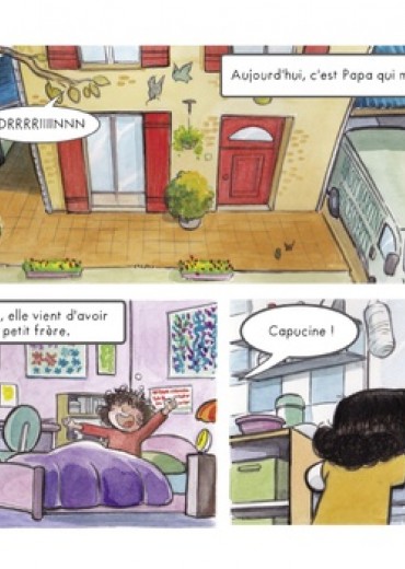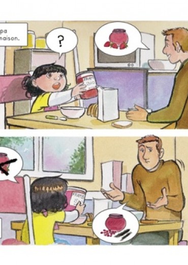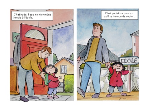 Aujourd'hui, comme tous les jours, Capucine va à l'école, mais c'est son papa qui l'emmène cette fois, car sa maman est à la maternité. C'est peut-être parce qu'il n'a pas l'habitude qu'il semble un peu perdu et livré à lui-même : il se trompe d'emballage au petit déjeuner, ou il prend le mauvais chemin pour aller à l'école... En route, Capucine croise sa copine Lola qui lui apprend que ses parents lui racontent toujours des histoires extraordinaires avant d'aller dormir. Capucine, elle, se rend compte que son papa ne lui lit jamais ce genre d'histoires le soir... Moitié BD, moitié album illustré, ce joli ouvrage, qui peut se lire tête-bêche et mis en images avec délicatesse par Cécile, nous décrit le quotidien d'une petite fille et de son papa illettré selon 2 points de vue différents. Réalisé en collaboration avec l'association BD Boum, qui lance chaque année des projets sur des problématiques sociales, Papa ne sait pas a pour vocation de sensibiliser les plus jeunes au phénomène de l'illettrisme en France et de relayer un message d'espoir, puisque les solutions pour s'en sortir existent !