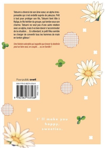 Tatsumi a divorcé de son âme soeur, un alpha irresponsable qui s'est endetté auprès de yakuzas. Prêt à tout pour protéger son fils, Tatsumi tient tête à Ryûga, le fils héritier du groupe, qui tombe sous son charme. Tatsumi ne veut pas d'une autre relation avec un alpha, mais il va bien devoir s'accommoder de la situation... En attendant, le petit Riku semble se charger de convertir tous les hommes de main en tonton gâteux !