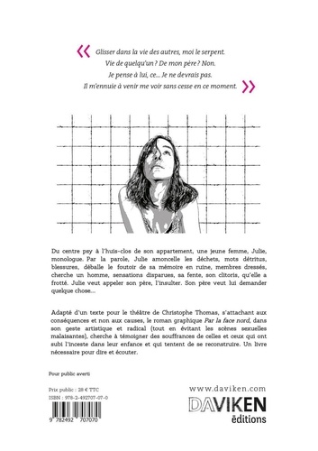 Du centre psy à l'huis-clos de son appartement, une jeune femme, Julie, monologue. Par la parole, Julie amoncelle les déchets, mots détritus, blessures, déballe le foutoir de sa mémoire en ruine, membres dressés, cherche un homme, sensations disparues, sa fente, son clitoris, qu'elle a frotté. Julie veut appeler son père, l'insulter. Son père veut lui demander quelque chose... Adapté d'un texte pour le théâtre de Christophe Thomas, s'attachant aux conséquences et non aux causes, le roman graphique Par la face nord, dans son geste artistique et radical (tout en évitant les scènes sexuelles malaisantes), cherche à témoigner des souffrances de celles et ceux qui ont subi l'inceste dans leur enfance et qui tentent de se reconstruire. Un livre nécessaire pour dire et écouter.