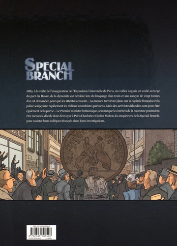 1889. Un voilier anglais est coulé par un submersible au large du port du Havre. Les responsables de cet attentat réclament vingt tonnes d'or de rançon, sans quoi ils menacent de s'en prendre ensuite à Paris, où se tient cette année l'exposition universelle ! Le premier ministre britannique décide d'y envoyer Robin et Charlotte Molton pour collaborer avec la sûreté générale française. A priori, les terroristes ont déjà sévi sur le sol français : un cheminot a été retrouvé égorgé et plusieurs kilos de dynamite ont été volés. Un symbole religieux trouvé sur les lieux du crime laisserait penser qu'il s'agit d'un coup des Fenians, un réseau d'activistes irlandais. Mais les agents du Special Branch ont l'habitude de ne pas se fier aux apparences... Nouvelle enquête autoconclusive des agents d'élite de la Special Branch, ancêtre de la police scientifique londonienne !