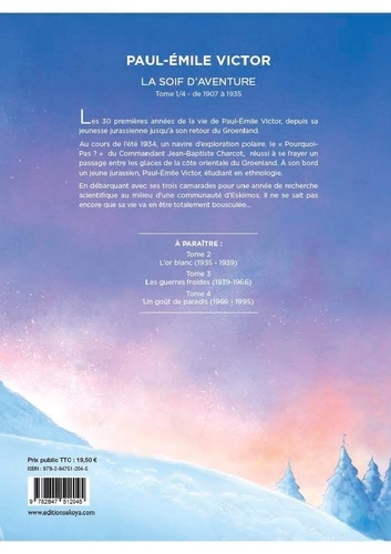 Une BD qui retrace les 30 premières années de la vie de Paul-Emile Victor, depuis sa jeunesse jurassienne jusqu'à son retour du Groenland. On découvre ainsi la fabrique de pipes en bruyère et de stylos de sa famille, ses excursions dans les Alpes avec les scouts, et ses rêveries d'aventures depuis le grenier de sa maison. Mais aussi sa première expédition polaire avec Jean-Baptiste Charcot. 1907-1925 : Le Jura entre nature et rêverie d'une vie future de grand voyageur. 1925 -1933 : L'adolescent s'adonne à la vie en plein air avec le scoutisme et l'aviation mais il est un jeune homme timide. 1933 - 1934A : Pour succéder à l'entreprise de fabrique de pipes et de stylos, Paul-Emile reçoit une formation scientifique avant de décider de goûter au large en intégrant la marine marchande puis la marine militaire. 1934 - 1935A : Retour dans le Jura après l'échec de ces é expériences. Victor convainc son père de le laisser partir à Paris pour réaliser des études d'ethnologie à Paris. Il écrit à l'explorateur polaire Jean-Baptiste Charcot pour le débarquer au Groenland orientale. Première expédition polaire française d'ethnologie qui dure un an. Mai 1936 - Juillet 1936A : Traversée d'ouest en est de la calotte glaciaire du Groenland en traîneau à chien, une première pour des Français, la cinquième du genre pour l'histoire du Groenland. L'expédition a failli virer, de peu, au cauchemar.
