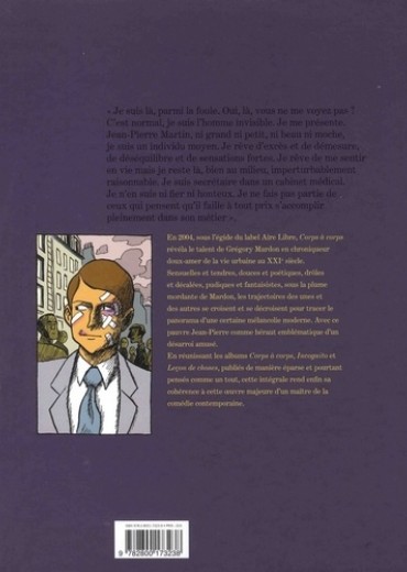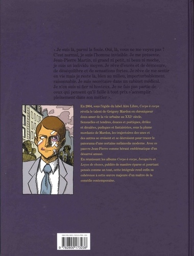 Ce volume comprend les albums suivants : "Corps à corps", "Incognito" et "Leçon de choses" : des récits uniques et intimistes qui ont fait la reconnaissance de leur auteur. Grégory Mardon publia pour la première fois des récits de quatre planches dans le Journal Spirou en 1998, récits qui reflétaient déjà la remarquable finesse avec laquelle il est capable de rendre compte des existences humaines. Son entrée sous l'égide du label "Aire Libre", en 2004, avec "Corps à corps", confirma son talent pour peindre avec une authenticité à la fois rare et originale les trajectoires d'êtres qui se croisent et se décroisent constamment. Car ainsi s'écoule la vie et ainsi Mardon la décrit-il, pleine de douceur et d'amertume, d'incertitudes et d'aspirations, ainsi nous imprègne-t-il de cette marée multicolore que compose la foule de ses personnages, se jouant d'eux comme de son lecteur à travers une oeuvre-puzzle riche d'humour et de fantaisie. Cette première intégrale inédite est un juste hommage à cet auteur complet et à la vaste fresque qu'il entreprit de dessiner en l'honneur des petites gens de l'ordinaire, parmi lesquels ce "pauvre" Jean-Pierre. Un ouvrage proche de nous, qui prouve que les voix et les récits contemporains ne sont pas en reste au sein du label "Aire Libre".