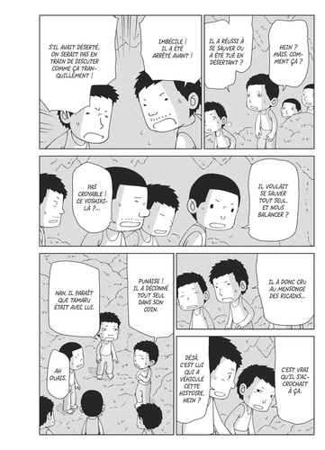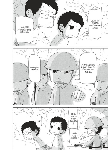 Le lieutenant Shimada dirige toujours ses soldats dans la logique d'une guerre qui se poursuivrait. Aveuglé par son nationalisme et son sens du devoir et de l'honneur, il a mis aux arrêts Tamaru et Yoshiki, et continue d'organiser des pseudo-raids avec la poignée de ses fidèles encore vivants. Mais plus le temps passe, plus la situation devient intenable : la famine guette, la malnutrition détruit les corps, les munitions se font rares et les patrouilles américaines tirent les survivants comme des lapins. Même leur abri souterrain finit par s'écrouler sous l'effet d'une pluie torrentielle. Le caporal-chef Kosugi, blessé à mort, décide de... suicider ses camarades en les empoisonnant. Un chaos dont vont profiter nos deux héros pour s'enfuir.