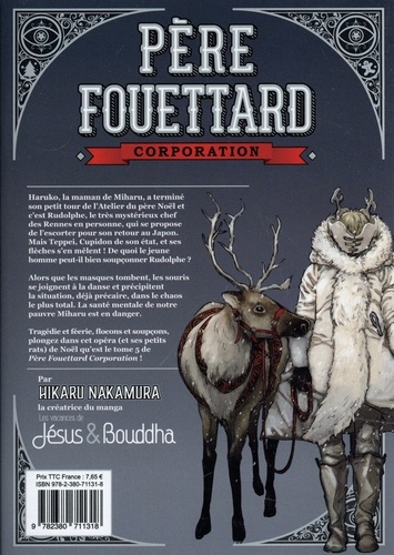 Découvrez le côté obscur du Père Noël ! Haruko, la maman de Miharu, a terminé son petit tour de l'Atelier du père Noël et c'est Rudolphe, le très mystérieux chef des Rennes en personne, qui se propose de l'escorter pour son retour au Japon. Mais Teppei, Cupidon de son état, et ses flèches s'en mêlent ! De quoi le jeune homme peut-il bien soupçonner Rudolphe ? Alors que les masques tombent, les souris se joignent à la danse et précipitent la situation, déjà précaire, dans le chaos le plus total. La santé mentale de notre pauvre Miharu est en danger. Tragédie et féerie, flocons et soupçons, plongez dans cet opéra (et ses petits rats) de Noël qu'est le tome 5 de Père Fouettard Corporation !