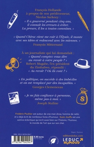 François Hollande à propos de son prédécesseur, Nicolas Sarkozy : "Il a gouverné pendant cinq ans, il connaît les erreurs à éviter. La preuve, il les a toutes commises." "Quand Chirac vient me voir à l'Elysée, il monte avec ses idées et redescend avec les miennes." François Mitterrand. A un journaliste qui lui demandait : "Quand comptez-vous dire au revoir à votre peuple ? " Robert Mugabe, l'ex-président du Zimbabwe, répondit : "Au revoir ? Où ils vont ? " "En politique, on succède à des imbéciles et on est remplacé par des incapables." Georges Clemenceau. "Je ne fais confiance à personne, même pas à moi." Joseph Staline.