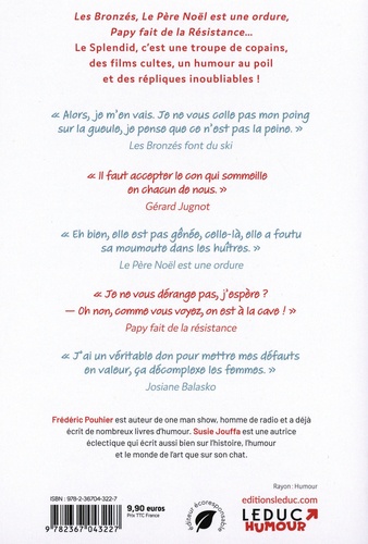 Les Bronzés, Le Père Noël est une ordure, Papy fait de la Résistance... Le Splendid, c'est une troupe de copains, des films cultes, un humour au poil et des répliques inoubliables ! "Alors, je m'en vais. Je ne vous colle pas mon poing sur la gueule, je pense que ce n'est pas la peine". Les Bronzés font du ski "Il faut accepter le con qui sommeille en chacun de nous". Gérard Jugnot "Eh bien, elle est pas gênée, celle-là, elle a foutu sa moumoute dans les huîtres". Le Père Noël est une ordure "Je ne vous dérange pas, j'espère ? - Oh non, comme vous voyez, on est à la cave ! " Papy fait de la résistance "J'ai un véritable don pour mettre mes défauts en valeur, ça décomplexe les femmes". Josiane Balasko Frédéric Pouhier est auteur de one man show, homme de radio et a déjà écrit de nombreux livres d'humour. Susie Jouffa est une autrice éclectique qui écrit aussi bien sur l'histoire, l'humour et le monde de l'art que sur son chat.