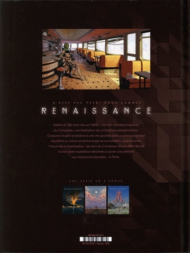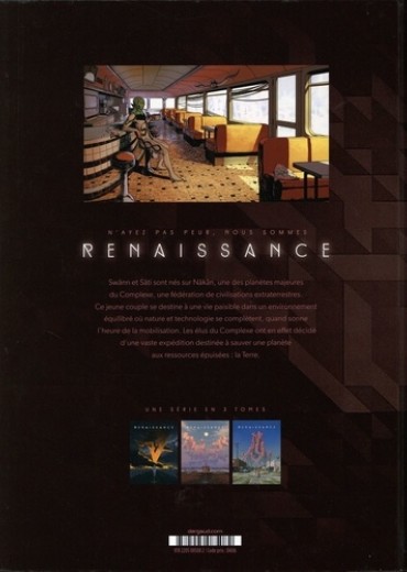 Au Texas, Swänn et Liz sont poursuivis par les braconniers Skualls, responsables de la mort de la famille Hamilton... Le temps pour Swänn de se confronter aux réalités de la guerre et des chocs émotionnels qui accompagnent l'annonce des victimes aux familles. Toutefois, alors que le Mur de Donald, séparant le Texas du Mexique sur le Rio Grande est détruit pour faciliter le passage des réfugiés américains, un petit espoir permet à Liz de rester debout. Pendant ce temps, sur Näkän et dans les assemblées du Complexe, les débats sur le financement de l'expédition Renaissance se poursuivent et, curieusement, la diplomatie Skuall, peuple qui ne participe pas à l'expédition, prend une importance inattendue... Un dernier chapitre magistral qui vient conclure cette première trilogie !